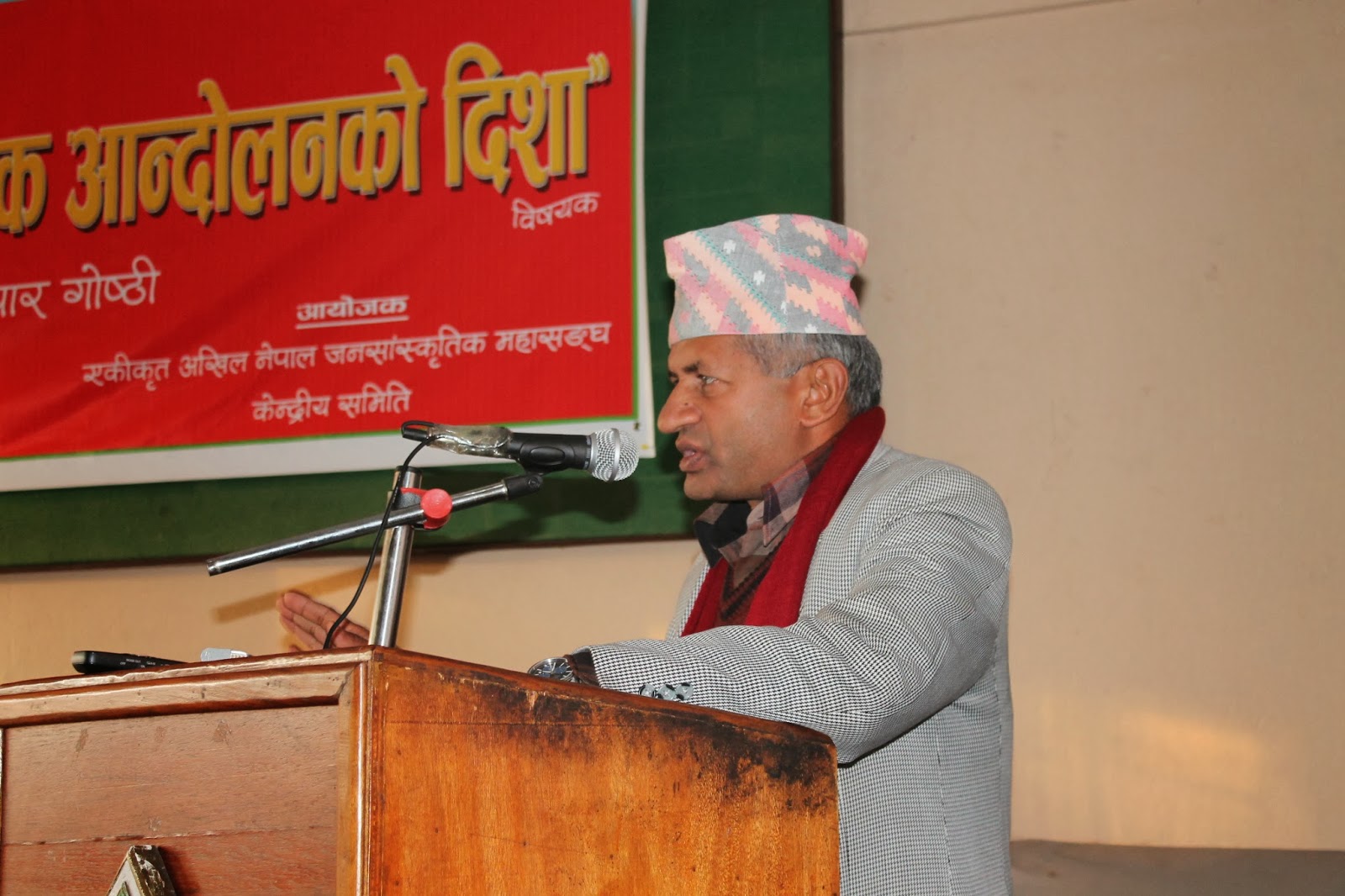 एकीकृत अखिल नेपाल जनसांस्कृतिक महासङ्घको आयोजनामा ‘वर्तमान सांस्कृतिक आन्दोलनको दिशा’ विषयक एक दिने विचार गोष्ठी यही २०७० साल पुस २० गतेका दिन नेपाल बार एसोसिएसनको सभा हल काठमाडौंमा सम्पन्न भयो । उक्त कार्यक्रममा ३ जना विद्वान सांस्कृतिककर्मीले कार्यपत्र प्रस्तु गर्नु भएको थियो भने ६ जना विद्वान वक्ताहरूले उक्त कार्यपत्रमाथि टिप्पणी राख्नु भएको थियो ।